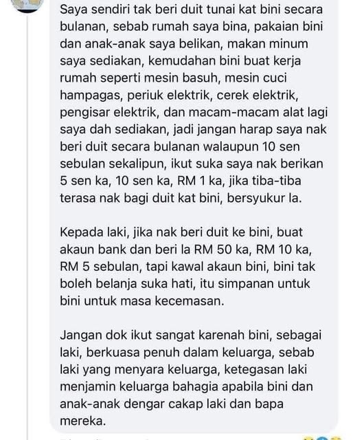 Balik kepada topik. Brader ni share yang dia dah sediakan semua dekat anak2 dan bini dia. Dia cakap sebab dia dah sediakan semua untuk bini dia, dia yak perlu bagi duit bulanan dekat bini dia.