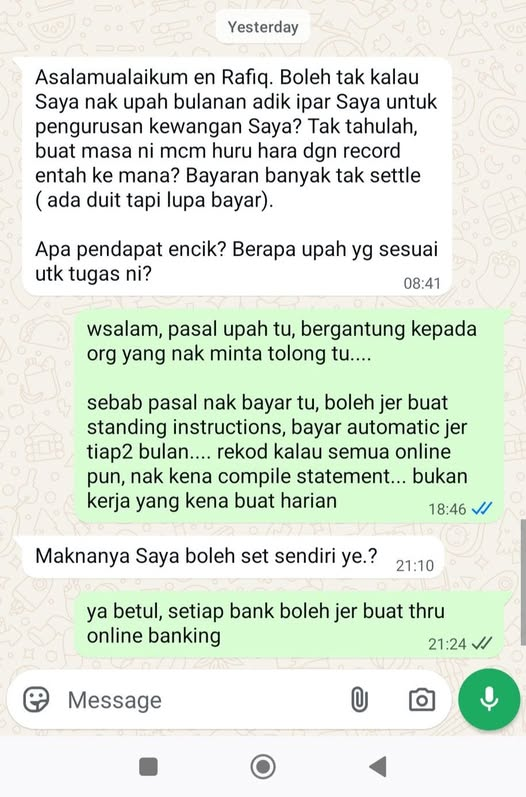 Ada klien msg, boleh tak nak upah adik ipar dia untuk uruskan kewangan dia?