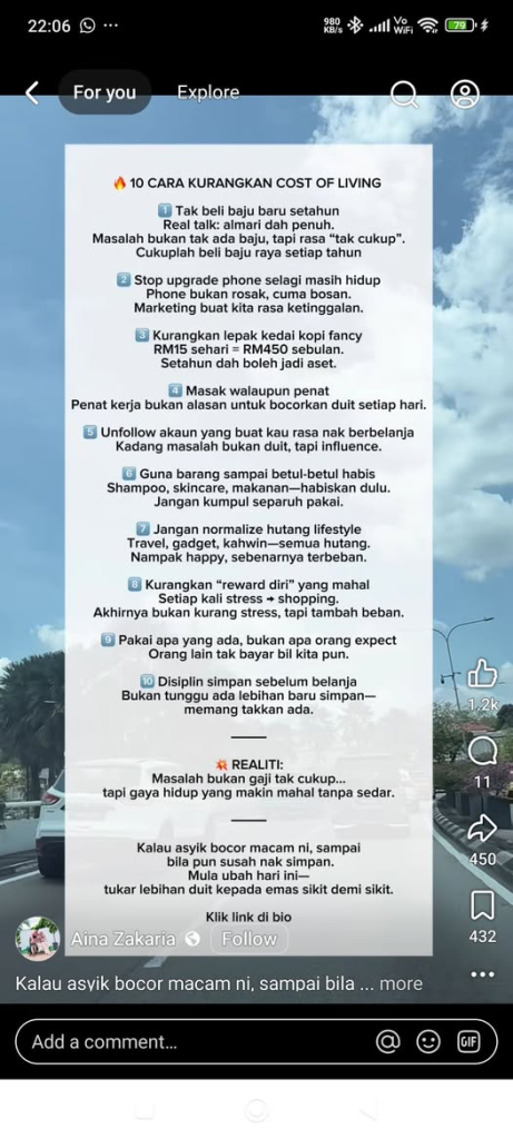 Keluar dekat FB Reel, Aina ada share tips macam mana nak kurangkan cost of living, lagi2 dalam situasi yang tak menentu macam skrg ni.