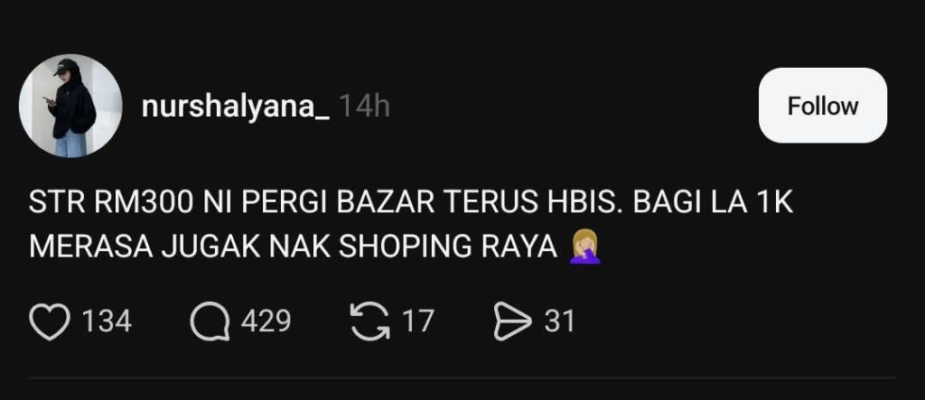 Tadi terbaca satu perkongsian dari Nurshaiyana. Dia kata ada orang dapat STR RM300, tapi bila pergi bazaar Ramadan terus habis. Lepas tu mula cakap,