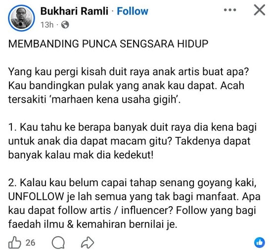 Skrg ni, sebab ada media sosial, lagi lah kita membanding. Kita nampak artis, celebrity, golongon T20 share kehidupan diaorang setiap hari dekat media sosial.
