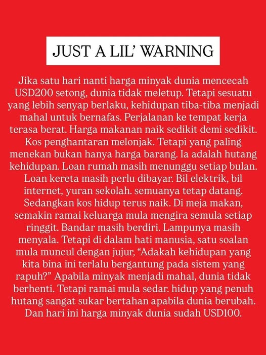 Ramai orang sekarang pun dah mula rasa. Diesel naik pun dah ramai mengeluh. Kalau minyak dunia betul-betul meletup, kesannya bukan kecil.