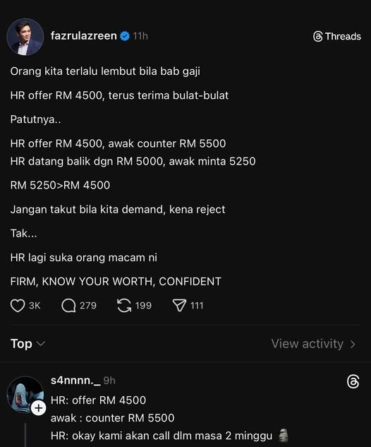 Kalau HR nego jadi RM3,750, gaji kita masih naik RM750 sebulan.