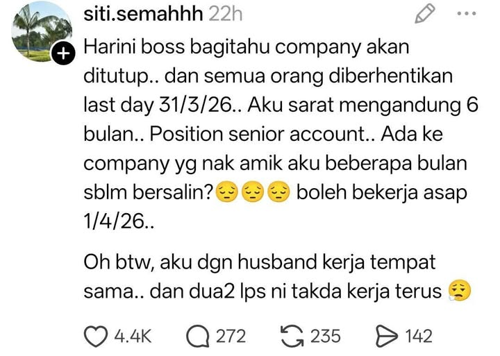 Sebab contoh yang jadi ni lah. Bila syarikat tutup, dua2 hilang kerja pada masa yang sama. Tambah lagi isteri tengah sarat mengandung dah 6 bulan pula tu.