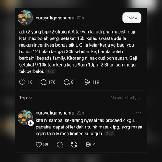 Kalau tengok screenshot, Nursyafiqa share yang dia menyesal jadi pharmacist. Dia menyesal tak proceed jadi cikgu dulu. Walaupun dia cakap awal2 pasal income tak tinggi, kalau baca betul2, dia rasa income tu tak berbaloi dengan masa yang dia kena habiskan untuk dapat income tu.