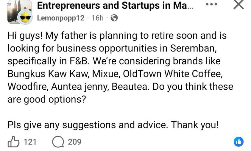 Ada ternampak satu post minta pendapat sama ada ayah dia yang nak bersara patut pilih franchise mana kalau nak buka bisnes F&B lepas bersara nanti.