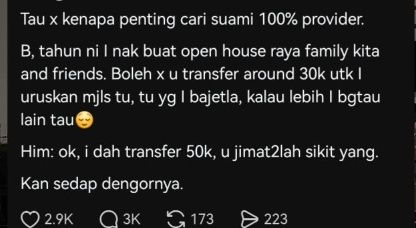 Dia tak termasuk beli rumah banglo, bagi kereta lambo, bayar tiket first class untuk gi travel dan tak masuk juga duit poket pun. Kalau ada suami yang mampi bagi semua tu dah lebih lagi, bersyukur lah.
