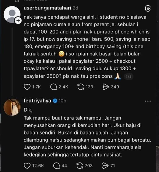 Sedas jer Fedtri bagi advice dekat student yang tanya sama ada patut ke tak dia upgrade phone kepada Iphone17 tapi nak pakai BNPL.